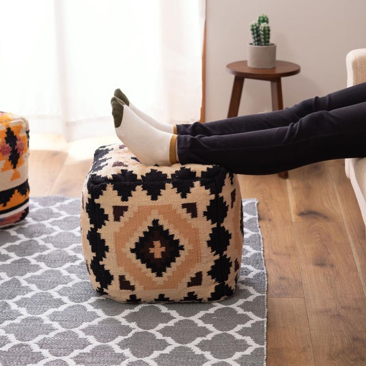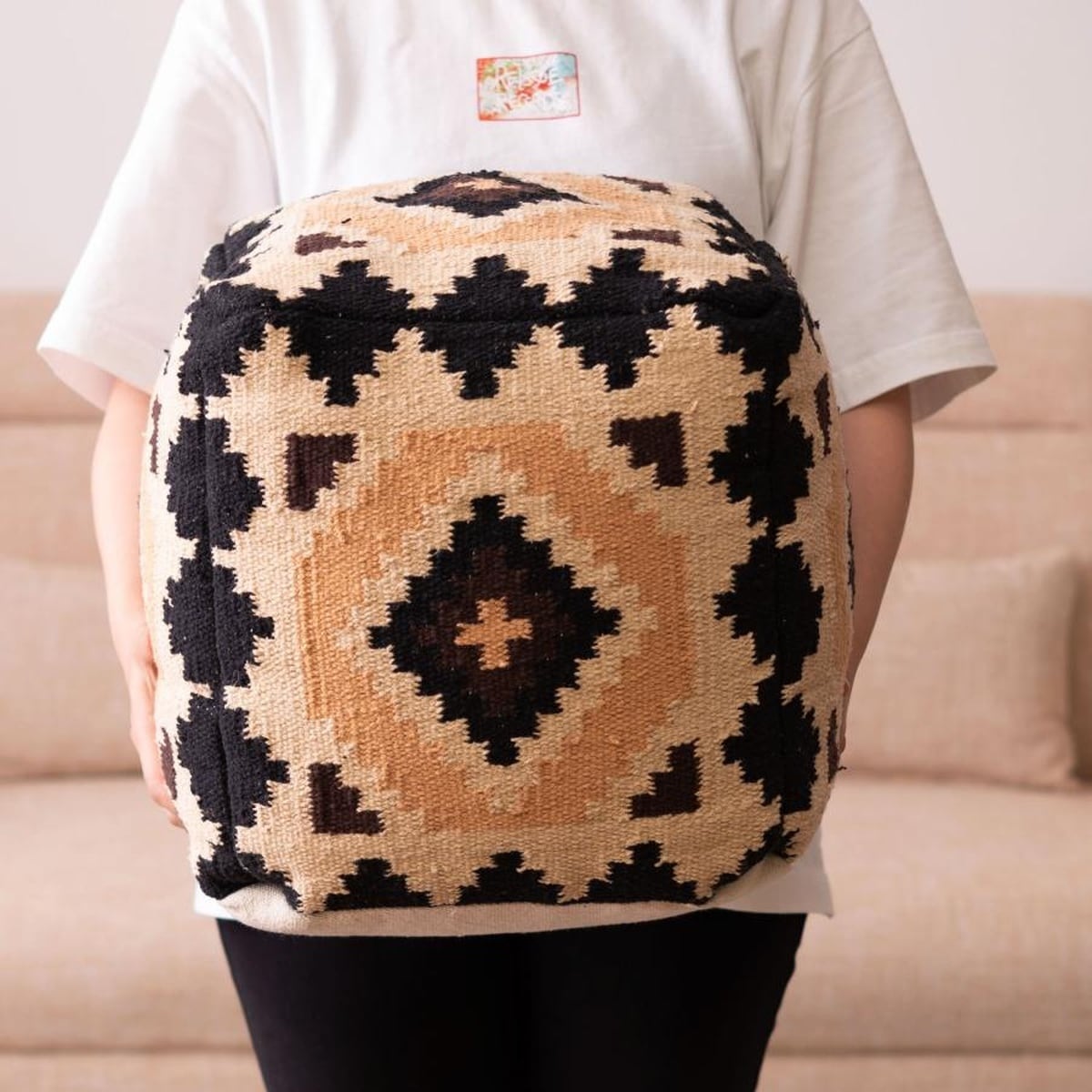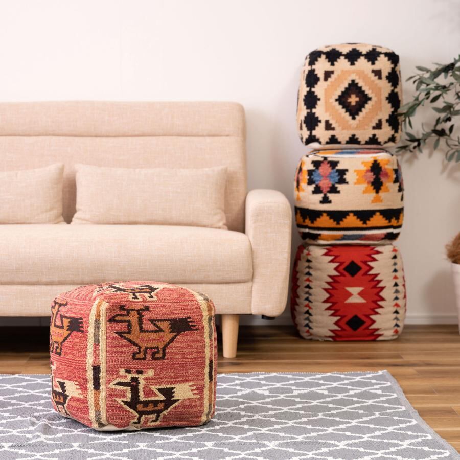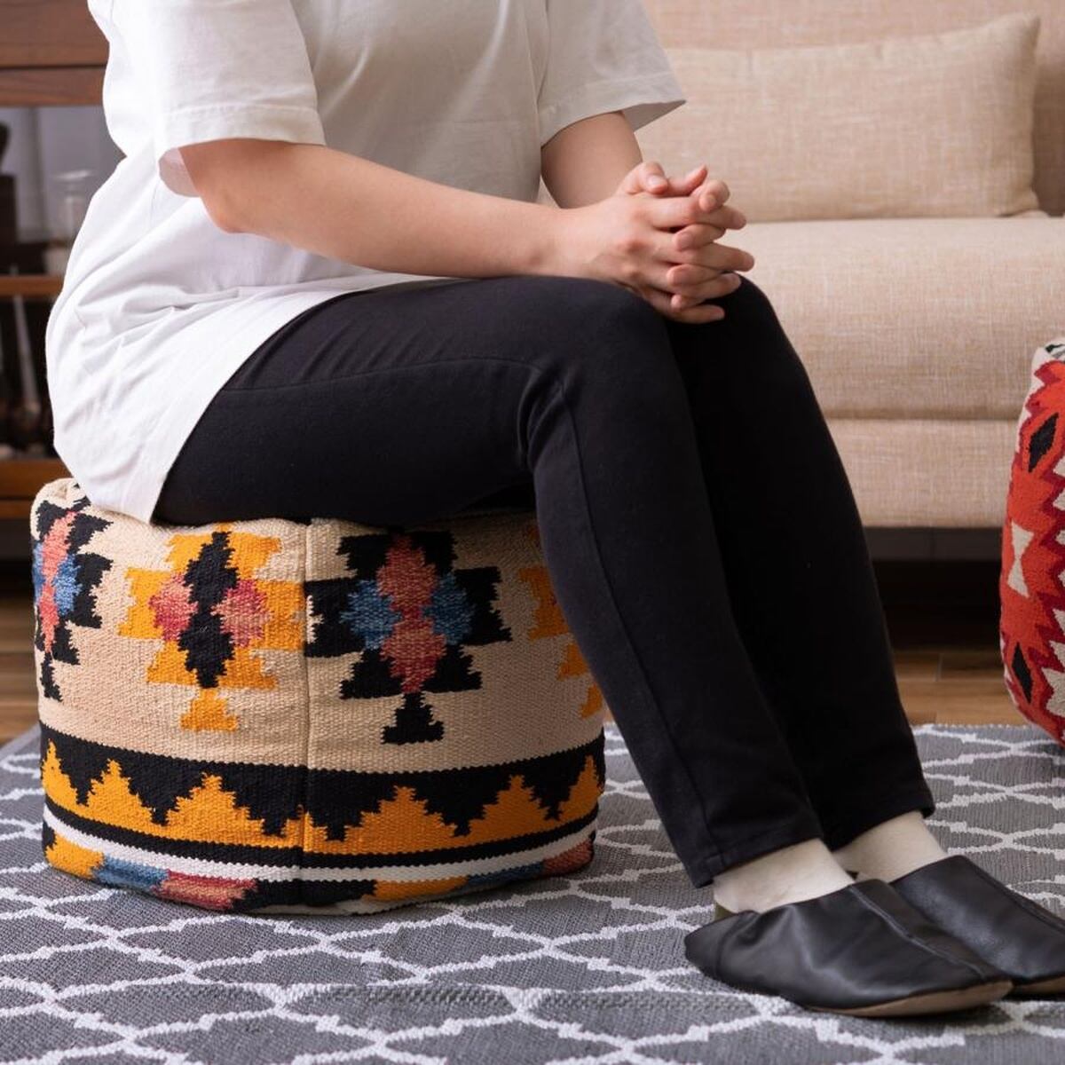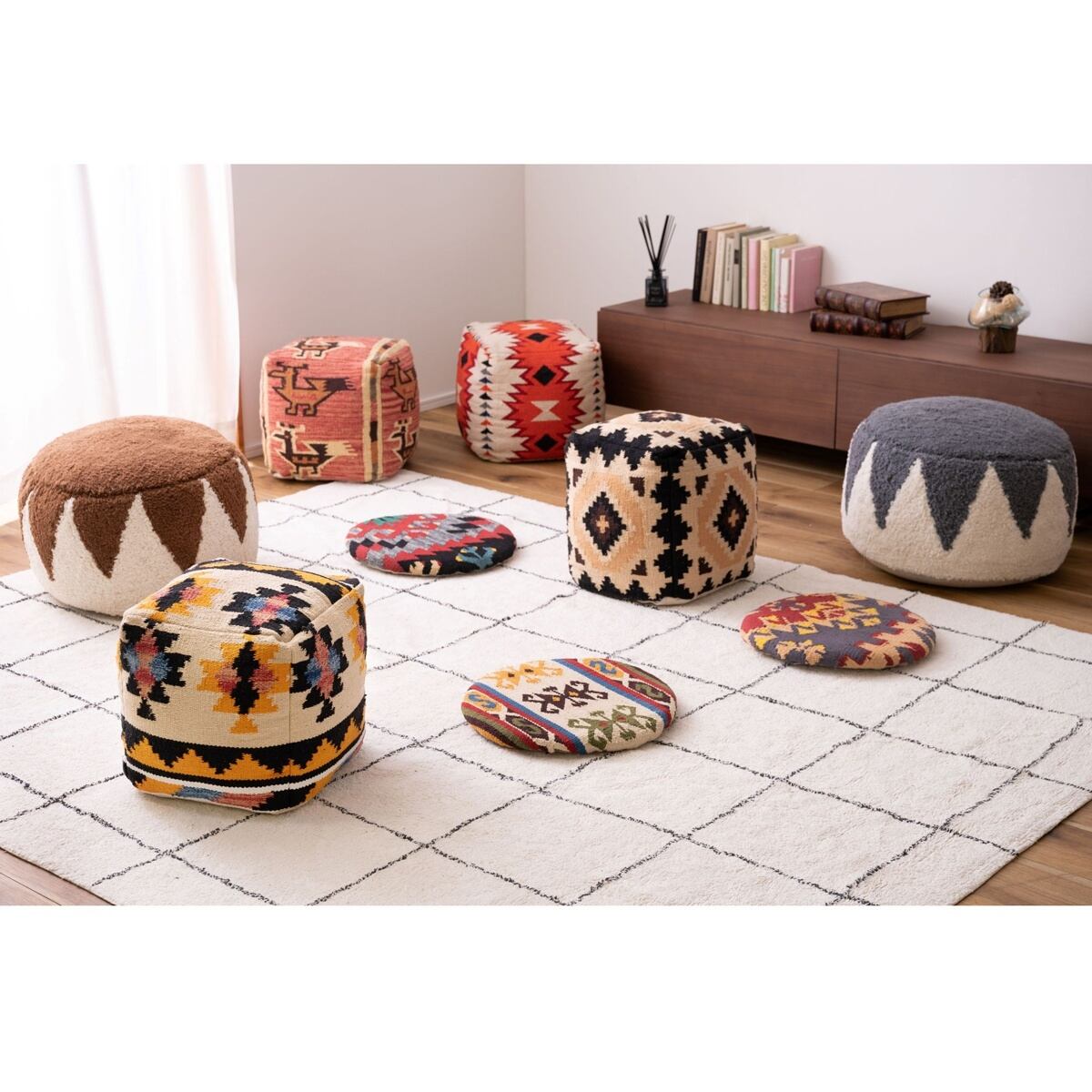 泡ビーズ×コットン素材のキリムスツールは、座椅子・オットマン・肘置きなど多用途に使えるリラックスアイテム。民族調のオルテガ柄がおしゃれで、お部屋のアクセントにも。軽量で持ち運びしやすく、ビーズのフィット感が心地よい座り心地を実現。リビングや寝室、ワークスペースにもぴったりなスツールです。かわいい見た目と実用性でギフトにもおすすめ。