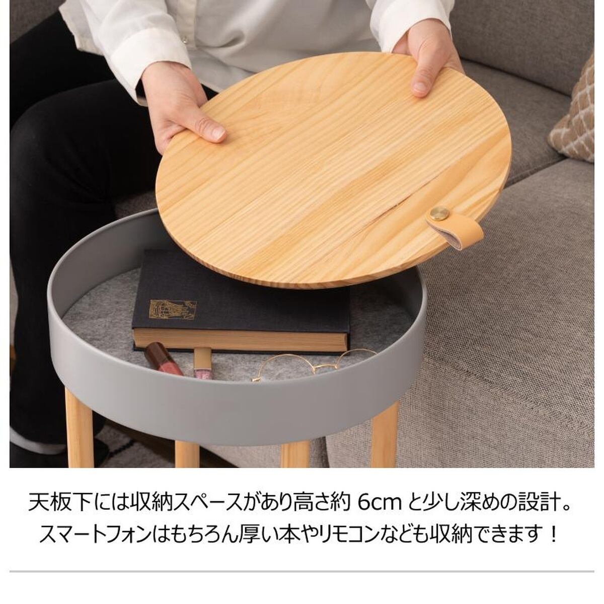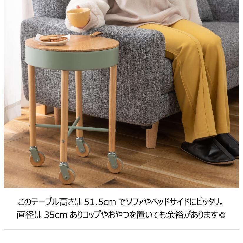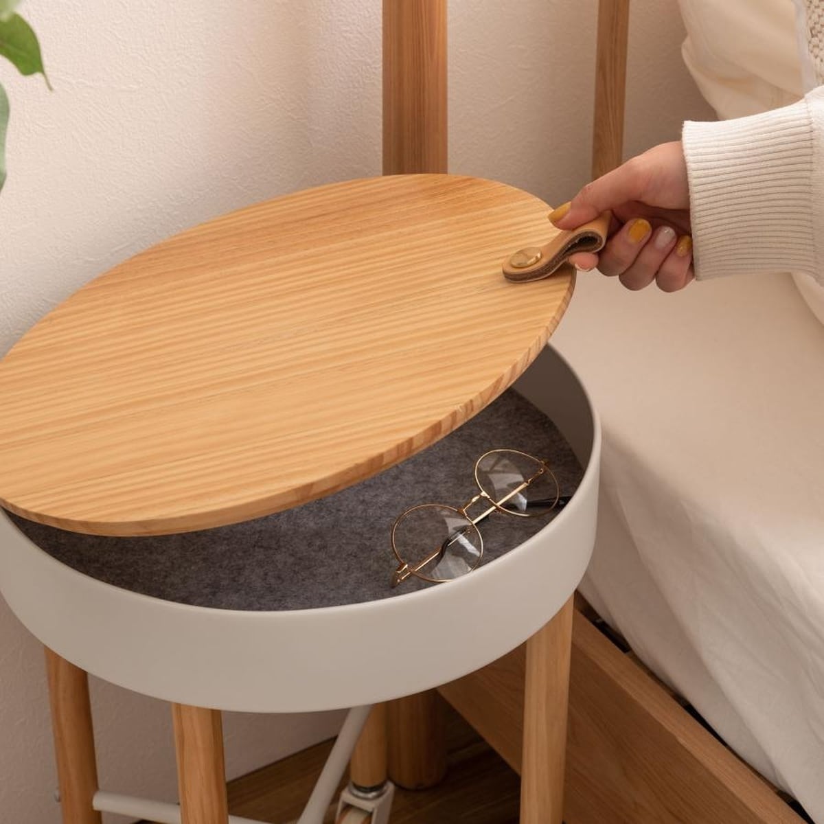 ●天板は直径約35cmなので、コップやお菓子、本などを置いても余裕が大きさ。天板は取り外しが可能。