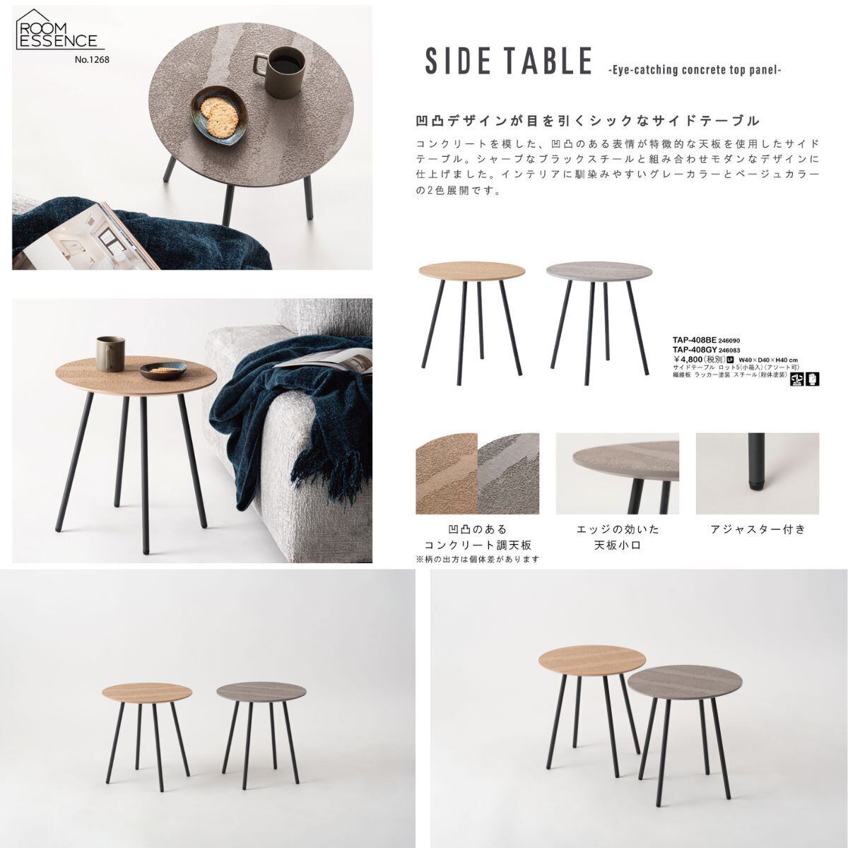 コンクリートを模した、凹凸のある表情が特徴的な天板を使用したサイドテーブル。