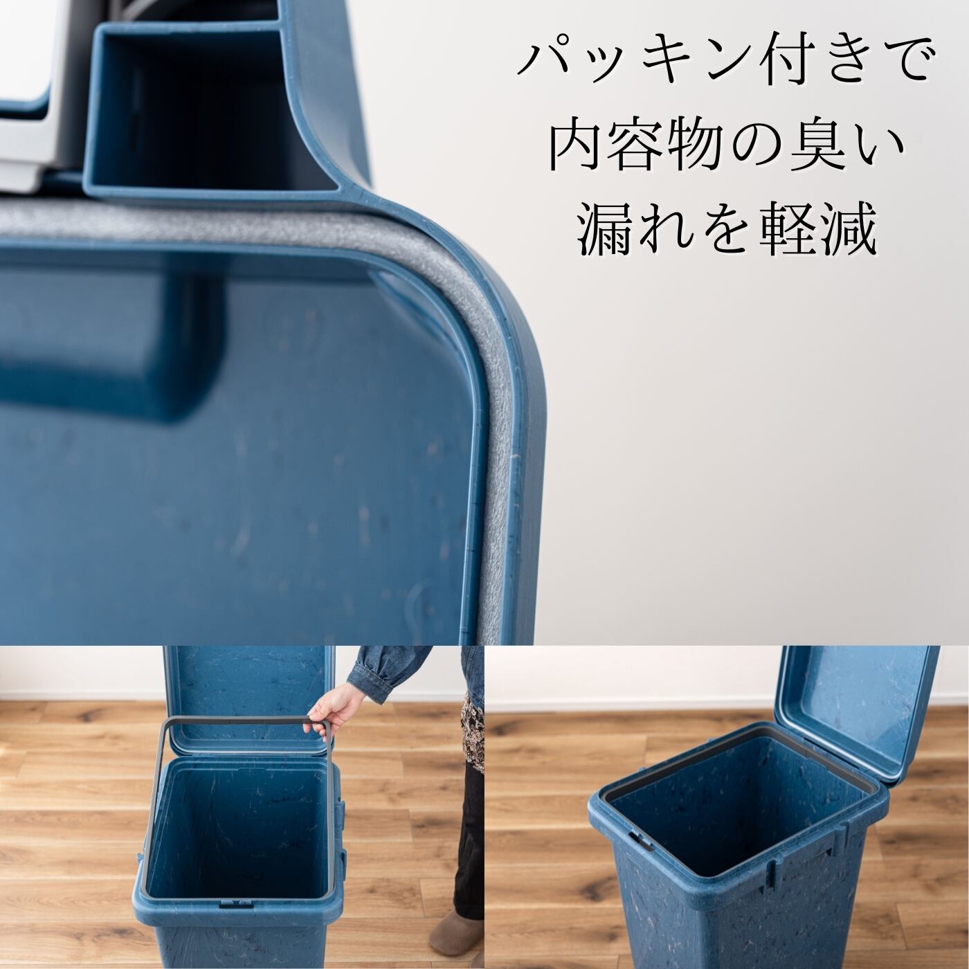 密閉力の高いパッキン付きフタとロック機能により、におい漏れやゴミの飛び出しを防ぎ、清潔に使えます。