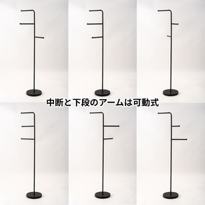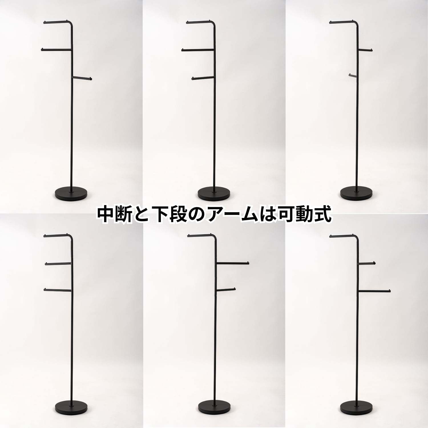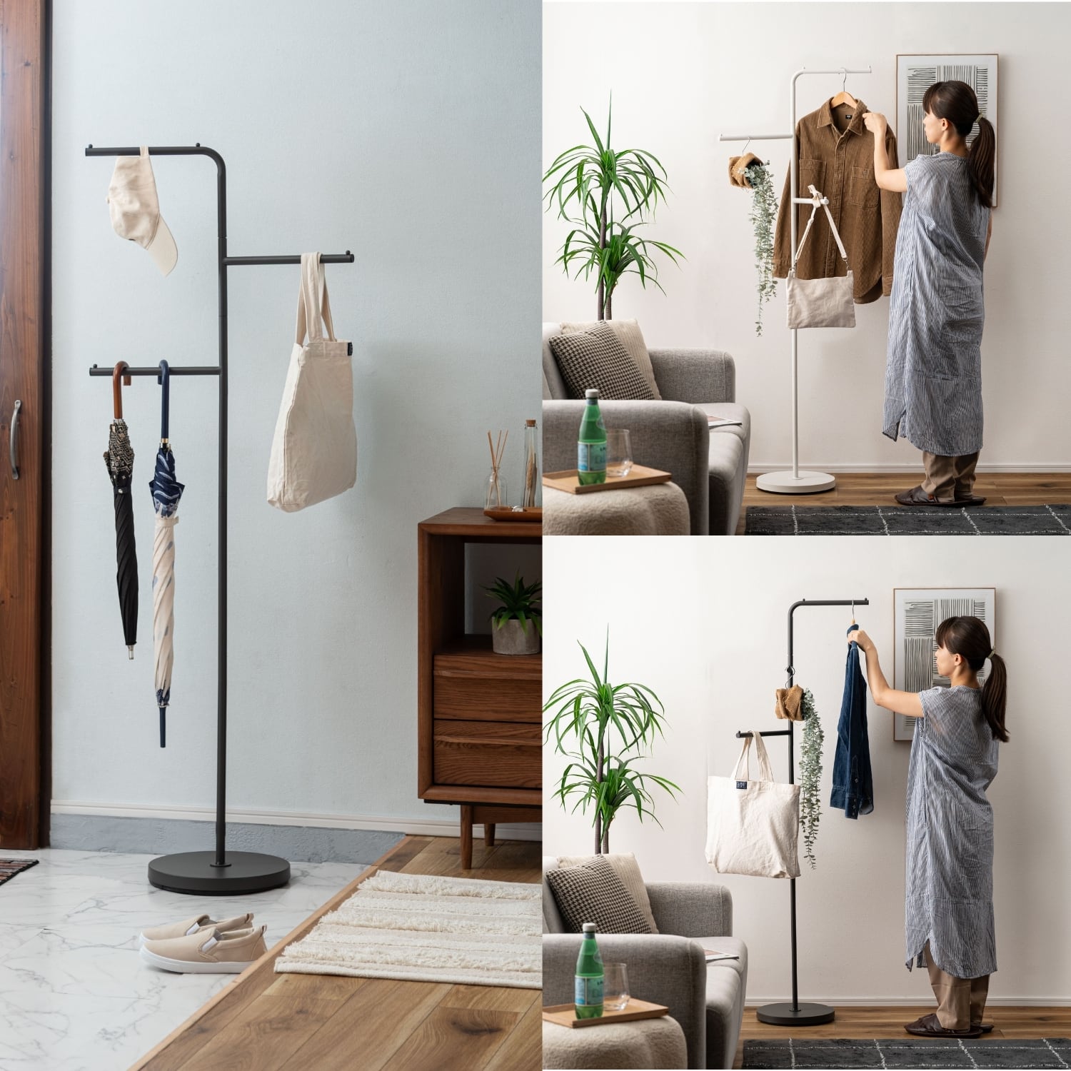 スリムな形状で様々なシーンで使うことができるハンガー。中段と下段のアームは左右に回転式で、掛けるものに合わせて調整ができます。 ブランケットやお気に入りのアイテムを、ディスプレイのように魅せながら美しく収納できます。シンプルな構造が空間にすっきりとなじみます。