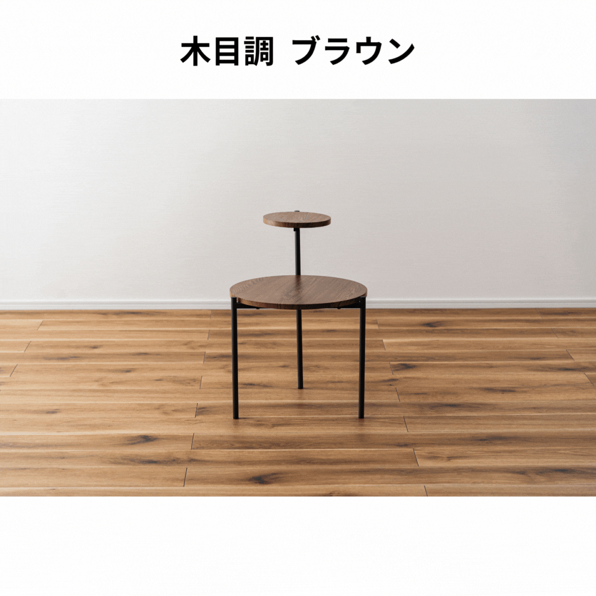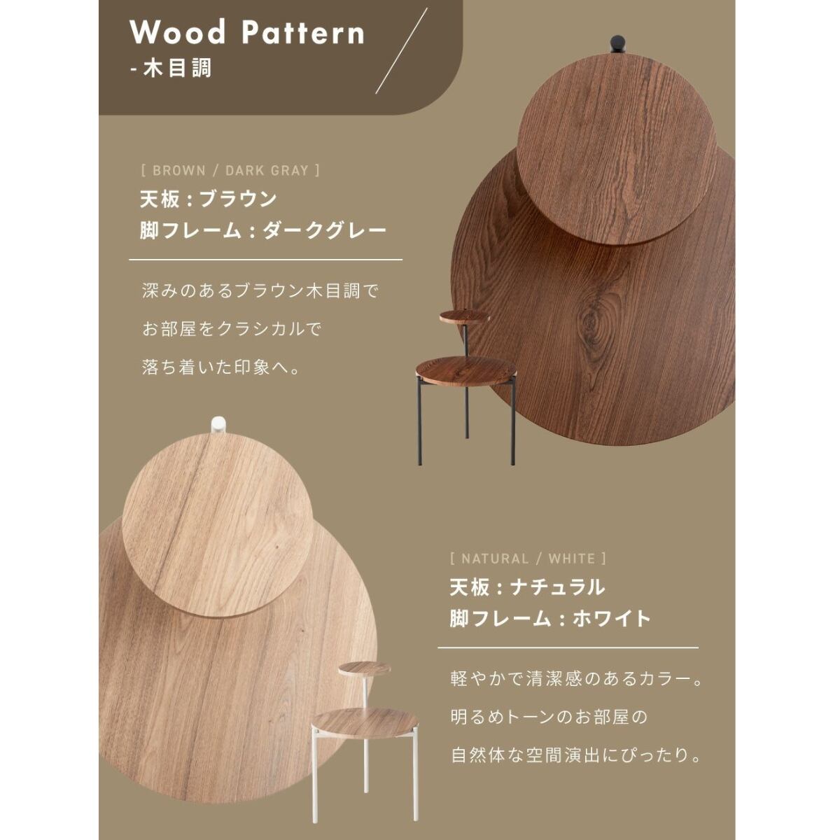 木目調や石目調の天板と、シャープなスチール脚を組み合わせ、モダンな印象に仕上げました。ソファサイドやベッドサイドにはもちろん、ディスプレイ用としても活躍します。