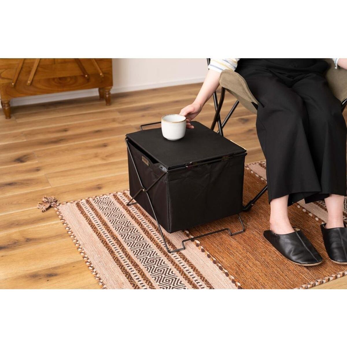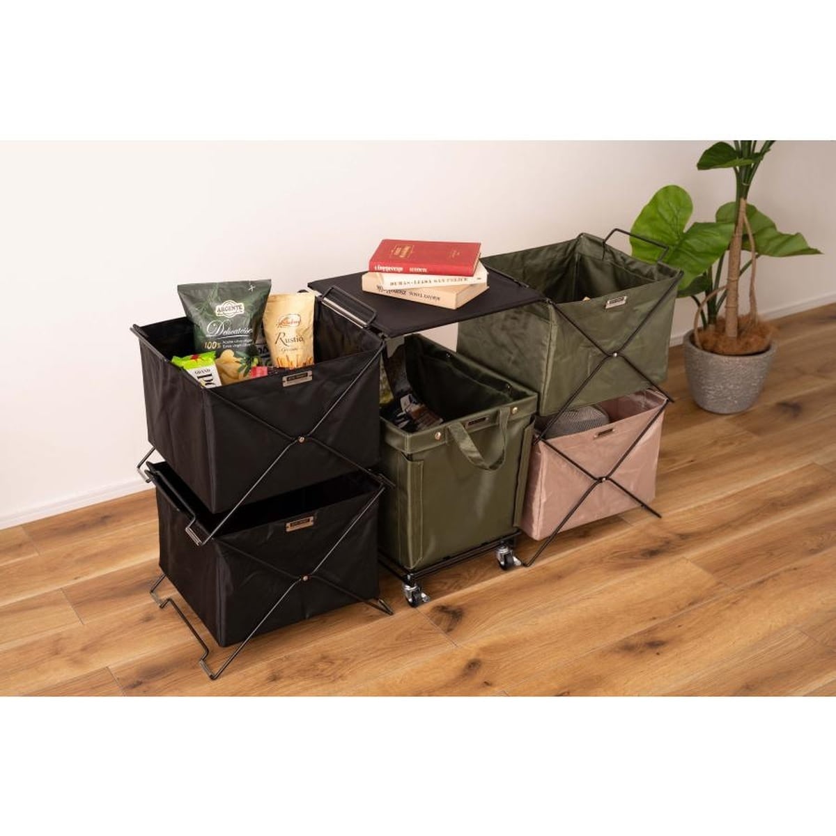 おしゃれなフタ付き折りたたみ収納ボックス(フォールディングバスケット)。スタッキング(積み重ね)可能で、サイドテーブルとしても使えるシンプルデザイン。リビングやアウトドアでの小物収納に最適なかごです。