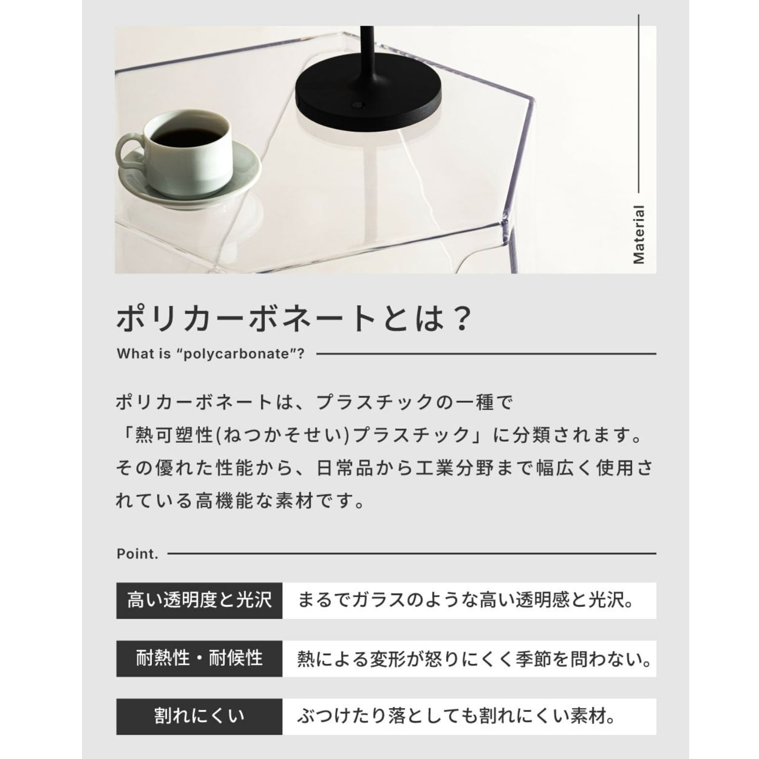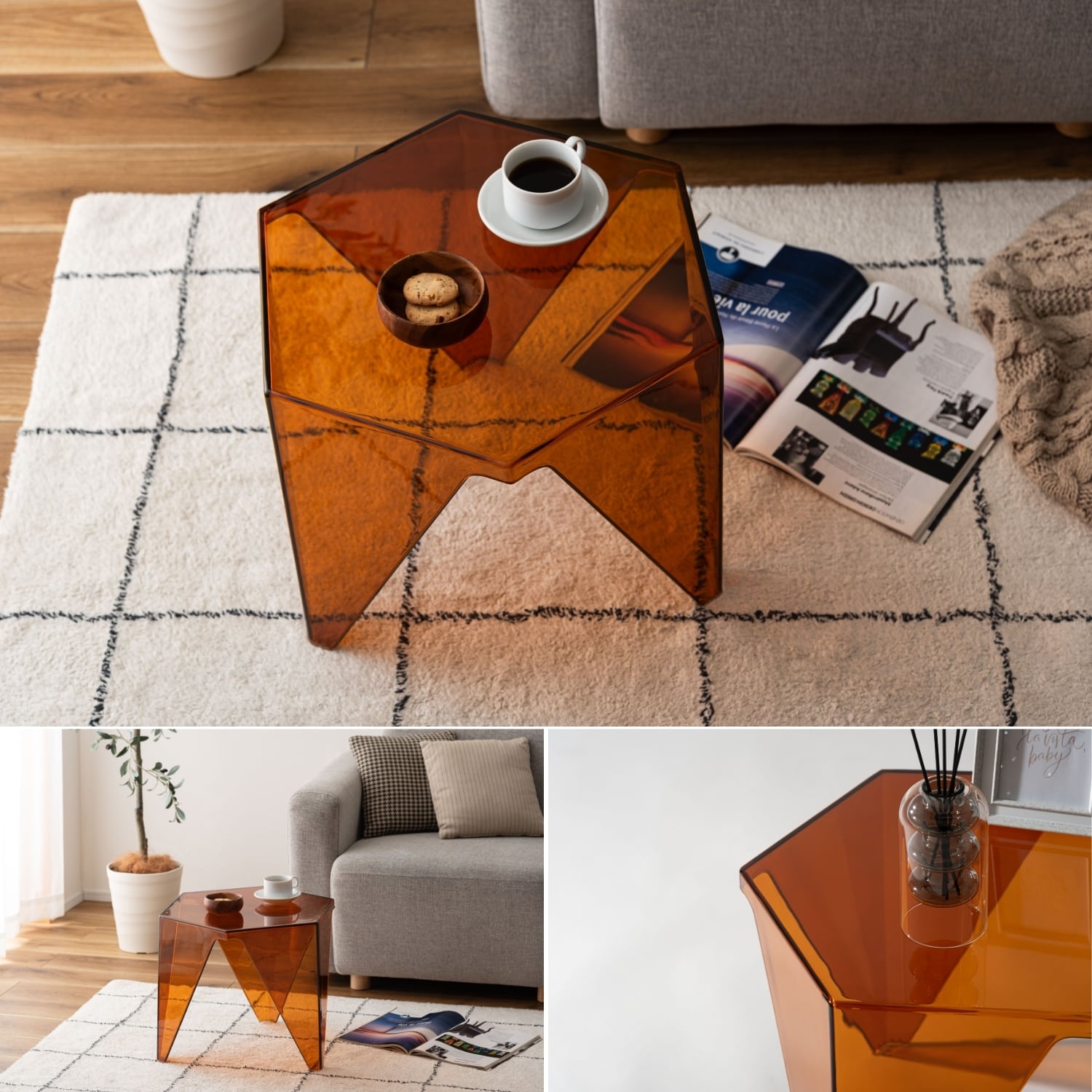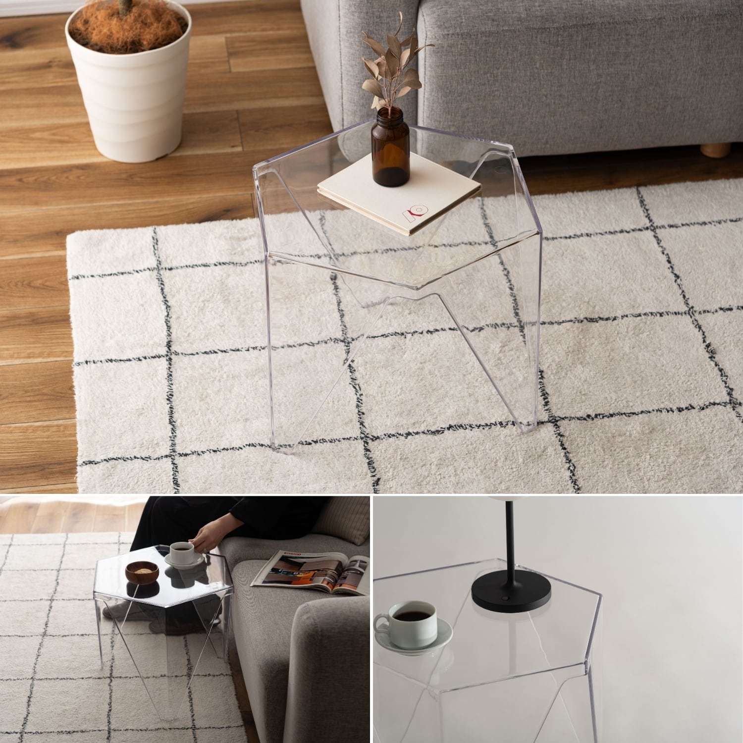 透け感と光沢が美しいサイドテーブル 。ポリカーボネート製で、まるでアート作品のような幾何学デザインが魅力です。光を透過し、お部屋にモダンな抜け感を演出。ソファ横やベッドサイドに最適なクリアテーブルです。