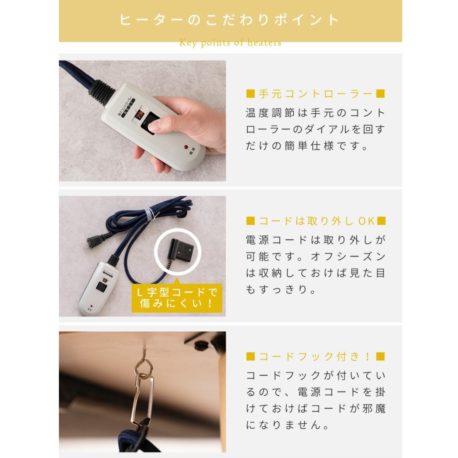 【材質】メラミン樹脂化粧繊維板 天然木(ラバーウッド) ウレタン塗装 カーボンフラットヒーター300W(MCR-301E) 手元コントローラー