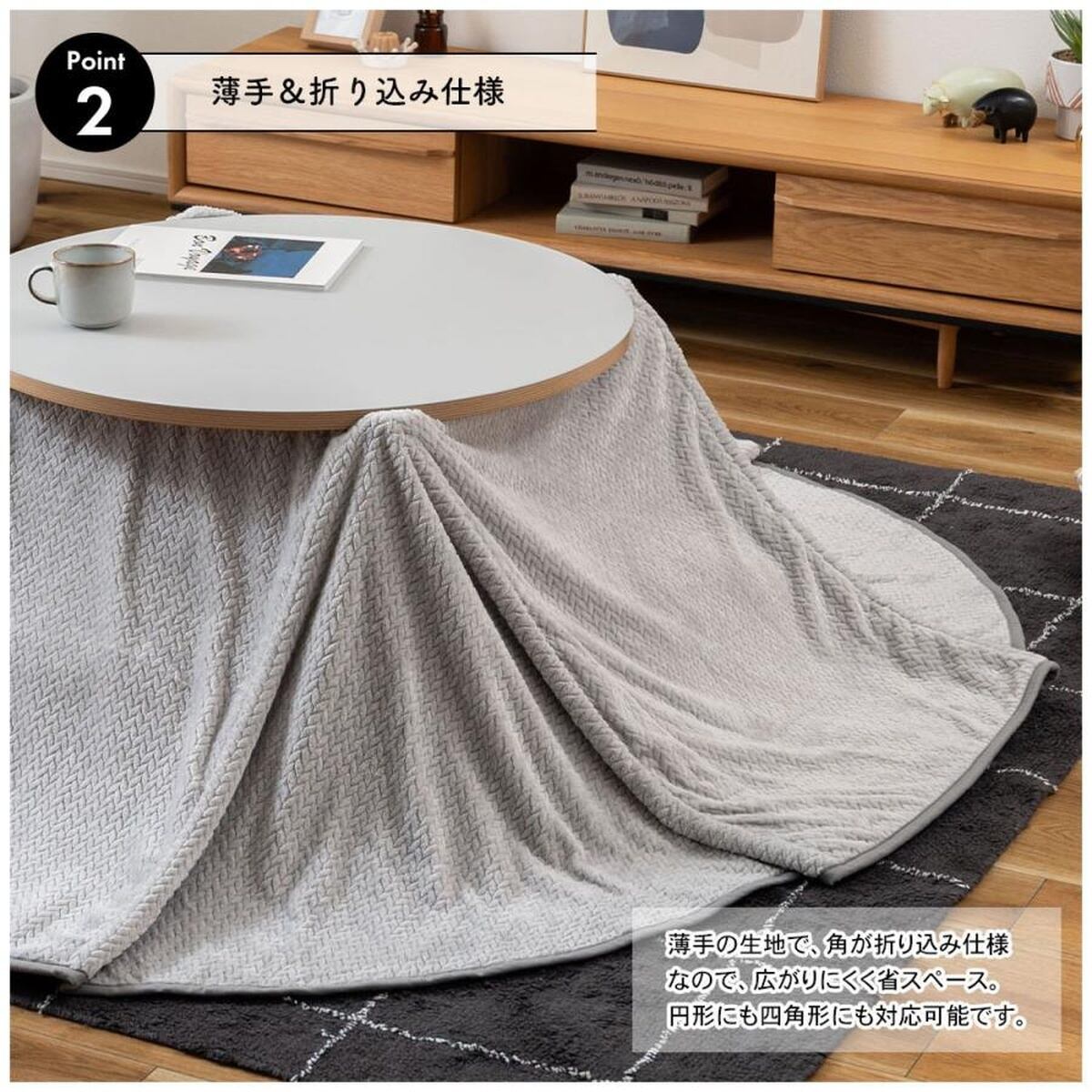 薄手・軽量ながら高保温のニット風裏ボア素材。丸型・正方形、ハイ/ロータイプこたつに対応する2WAYこたつ布団。省スペースで冬のリビングをおしゃれに暖めます。