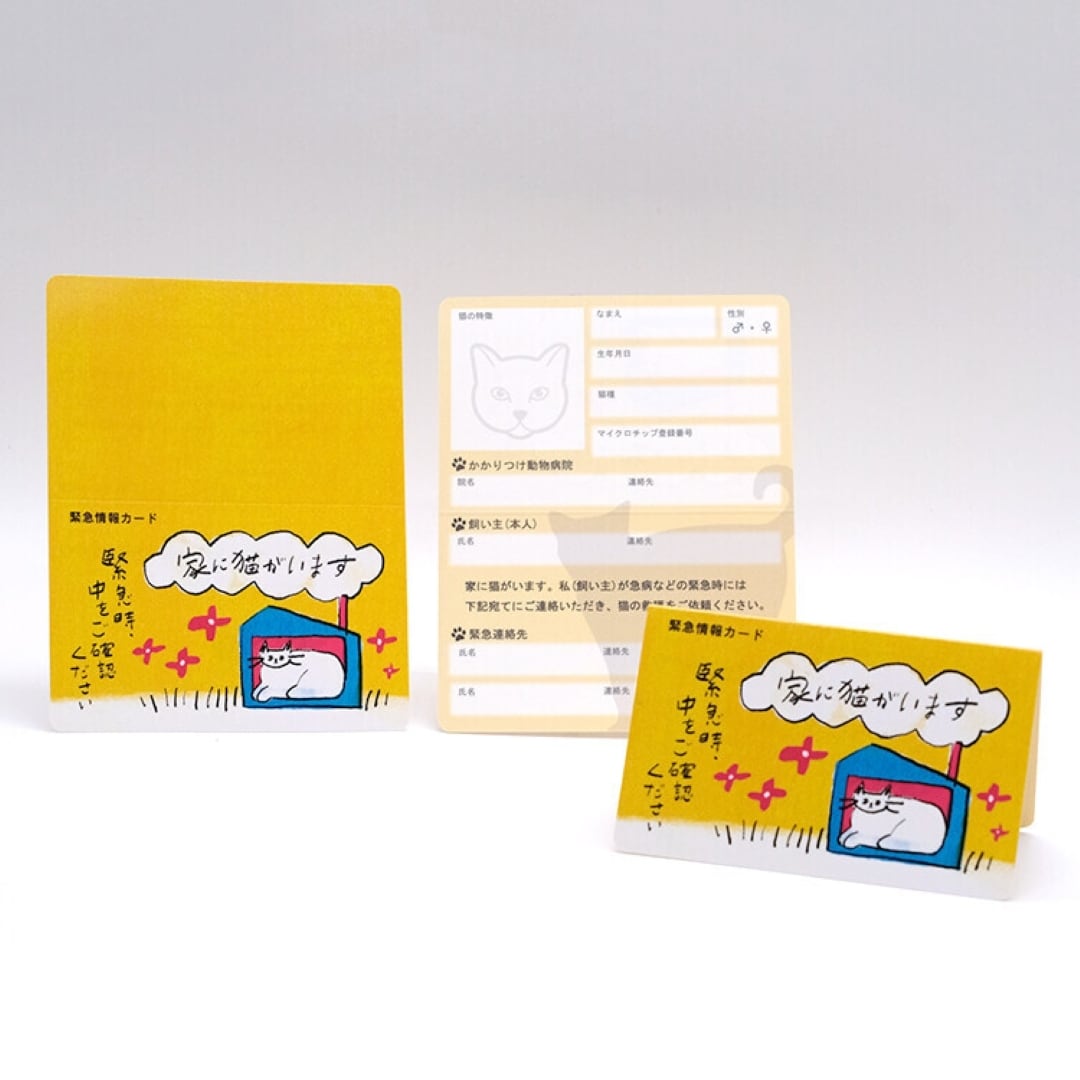 ・外出中の飼い主に万が一のことがあった時、自宅でお留守番中の猫の救護を依頼するための携帯用緊急情報カード、3枚セットです。