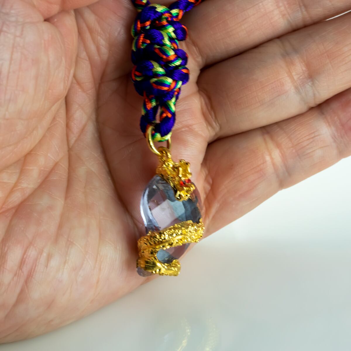 龍は天高く昇る生き物で、古くから物事が上昇することの象徴として考えられています。その龍が、魔除けや厄除けといった呪的な意味で身につけられてきたとされる「勾玉」に絡み合う、とても縁起の良いお守りです。