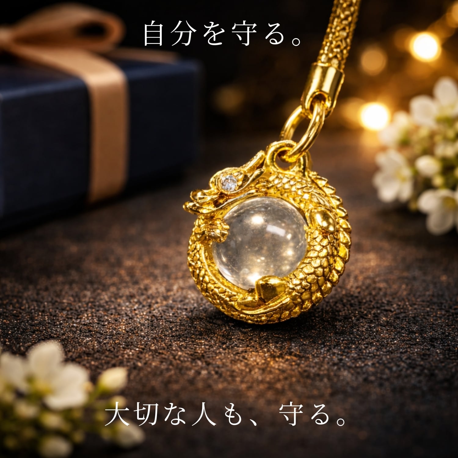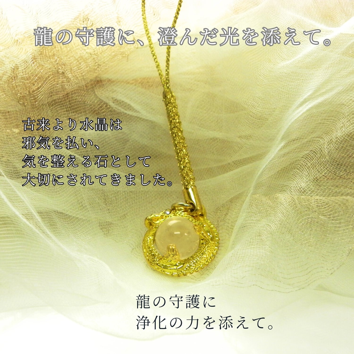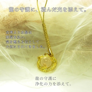 龍は天高く昇る生き物で、古くから物事が上昇することの象徴として考えられています。その龍が、浄化のパワーストーンとして知られる「水晶」に絡み合う、とても縁起の良いお守りです。