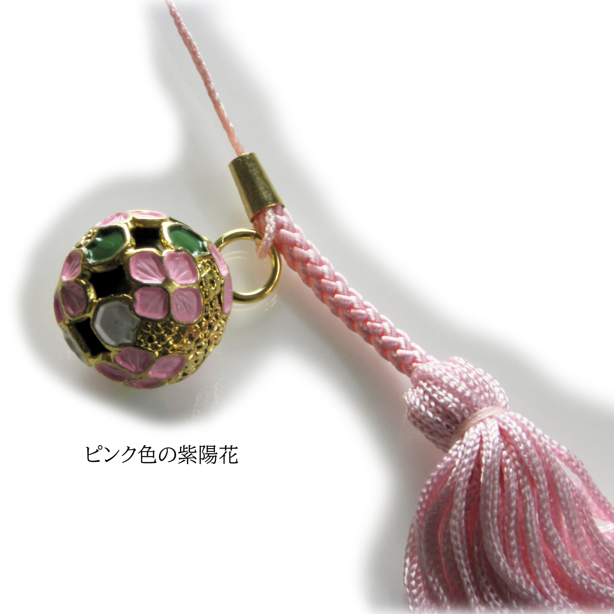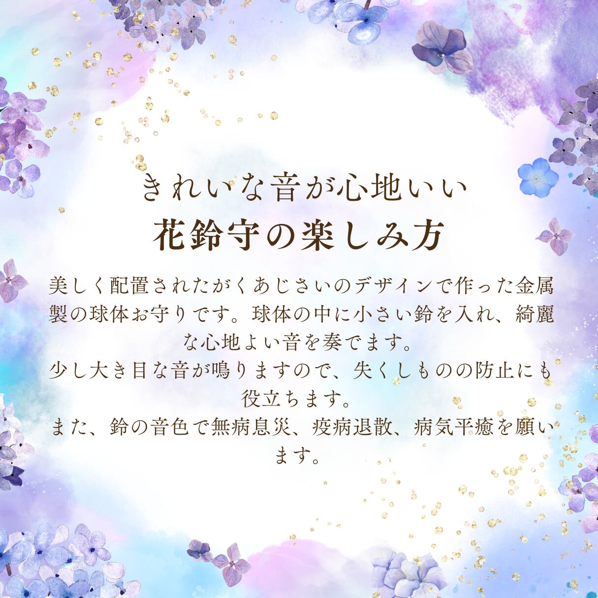 美しく配置されたあじさいのデザインで作った金属製の球体お守りです。球体の中に小さい鈴を入れ、綺麗な心地よい音を奏でます。