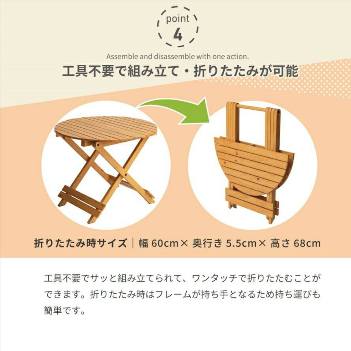 ●工具不要で簡単組み立て、ワンタッチで折りたためる便利なラウンドテーブル。