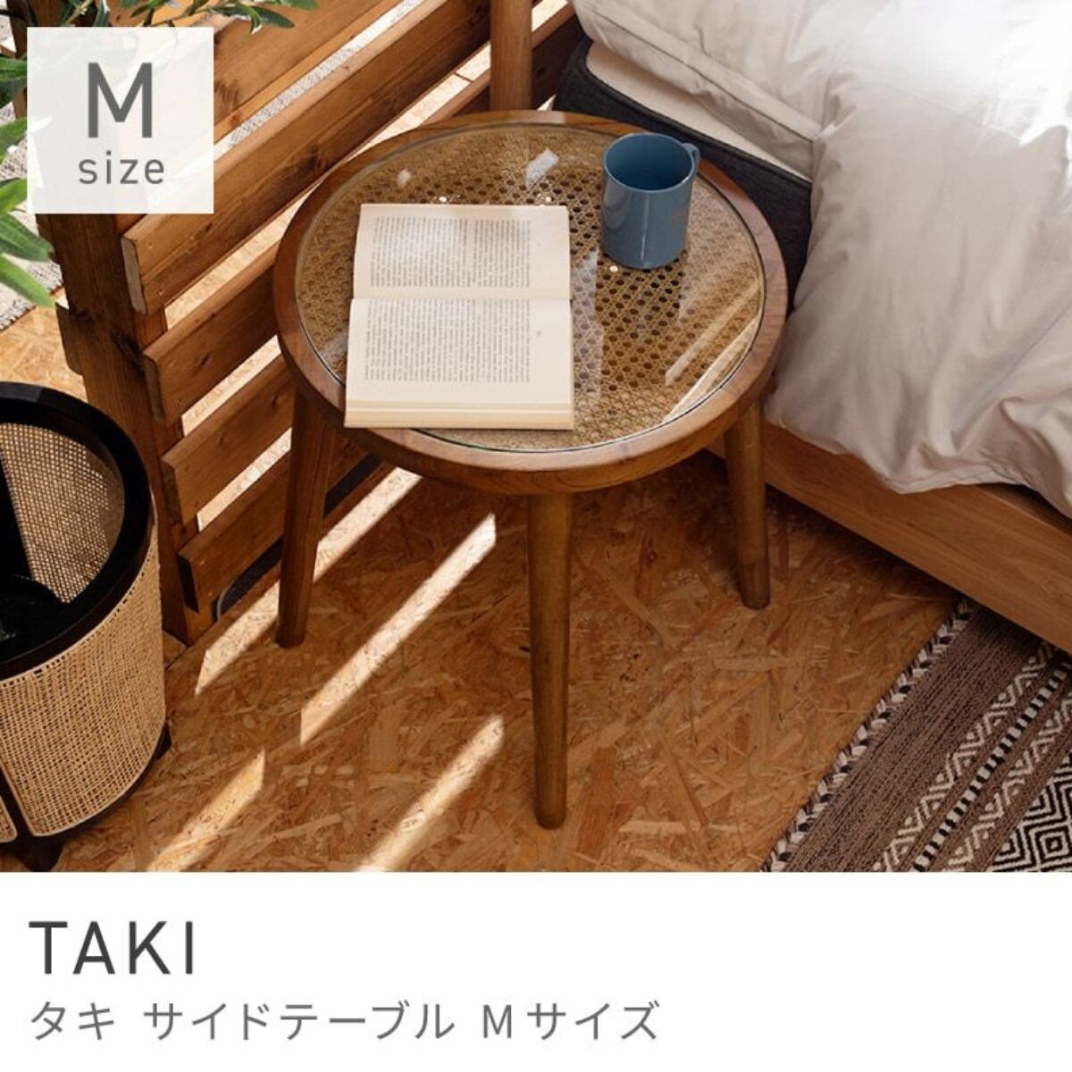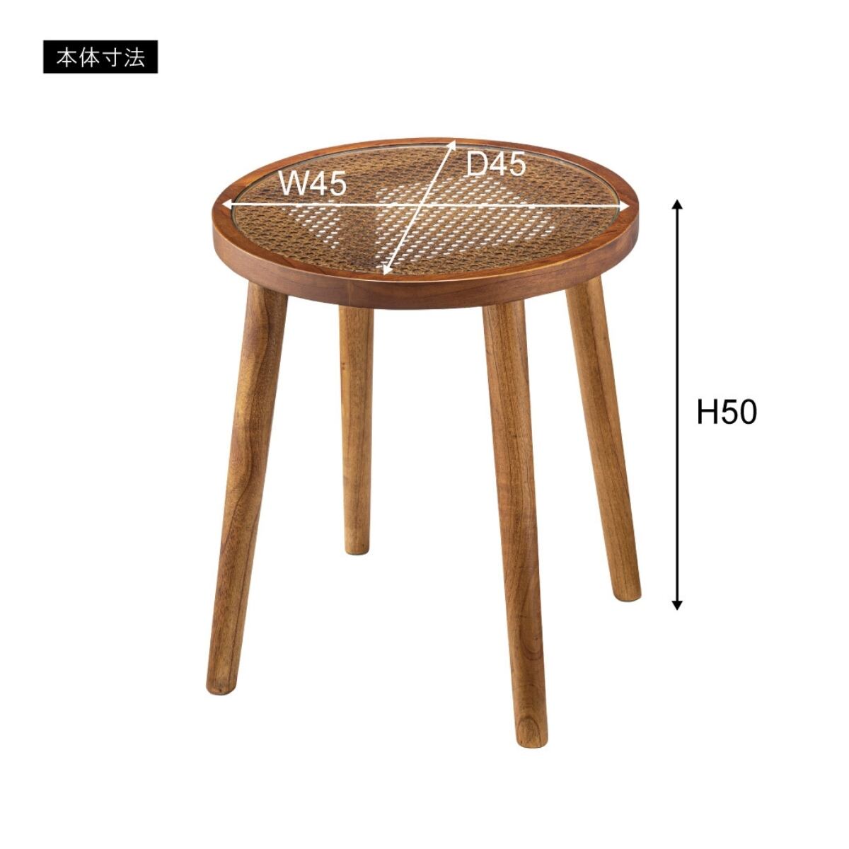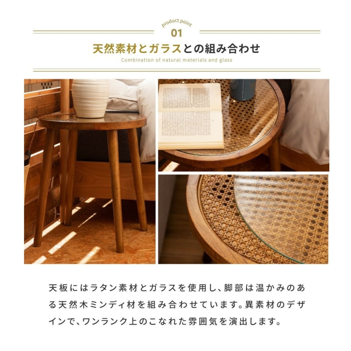 ラウンドガラステーブルM 45cm 天然木ミンディ+ラタン 北欧モダン 強化ガラス サイドテーブル インテリア