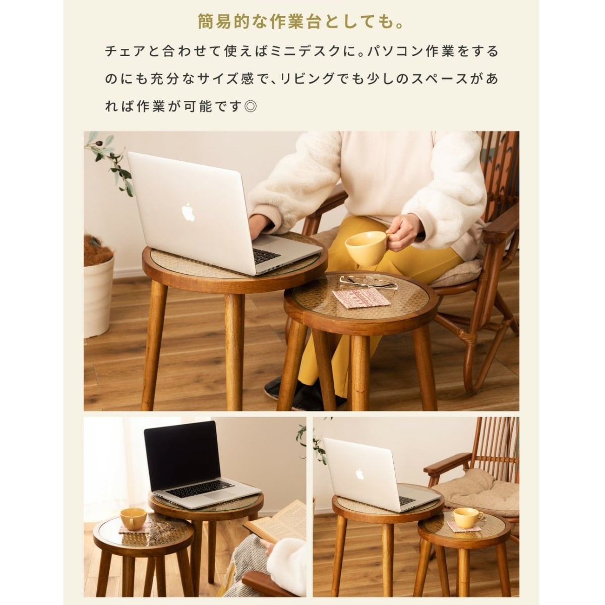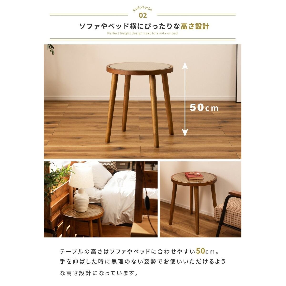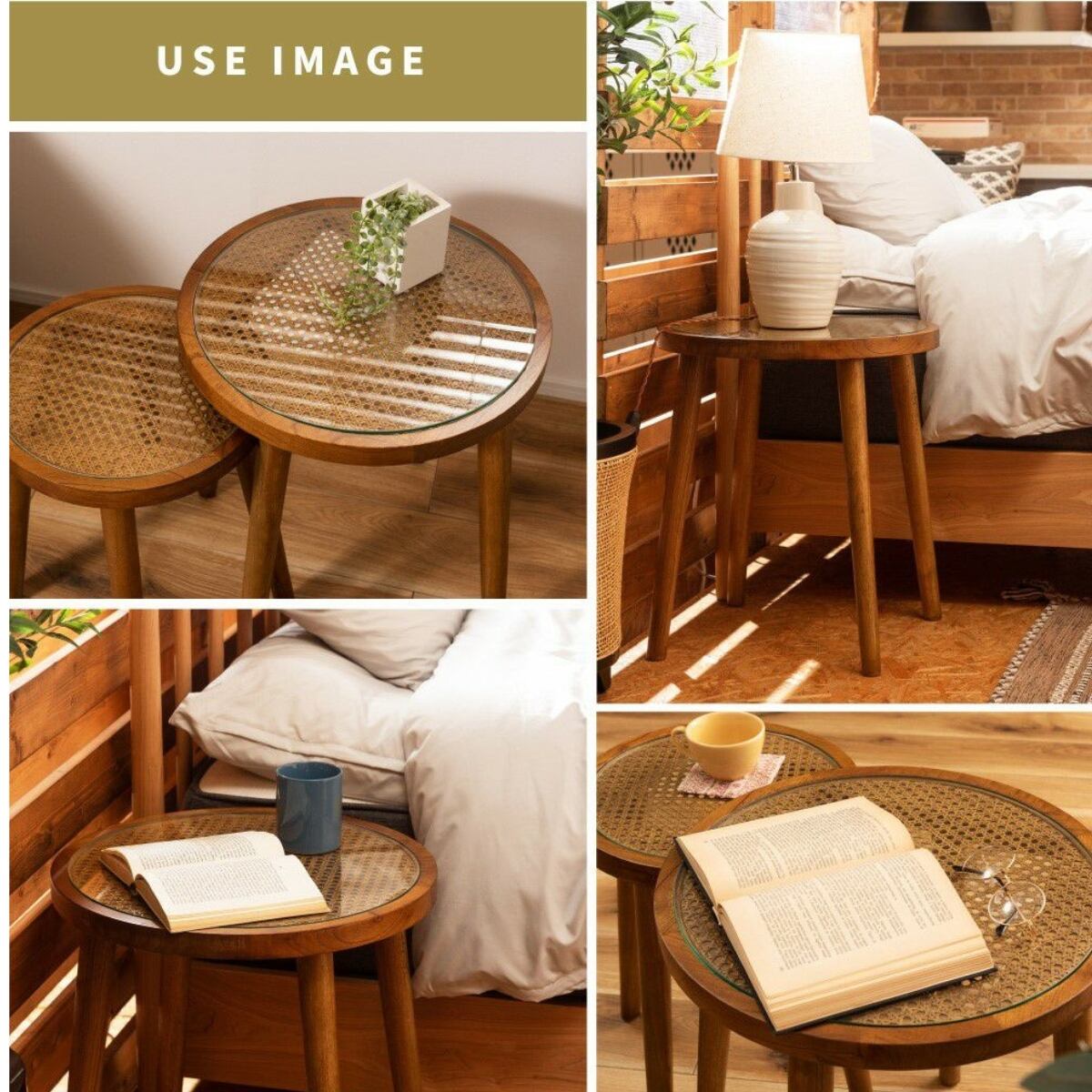 幅約45×高さ50cmのラウンドガラステーブルM。天然木(ミンディ)×ラタン素材と5mm強化ガラスを組み合わせた北欧モダンな逸品。軽量約4kg、耐荷重5kg、組立式。脚裏フェルトで床を保護し、リビングや寝室のサイドテーブルにぴったり。新生活にも調和するナチュラルでおしゃれなデザインです。