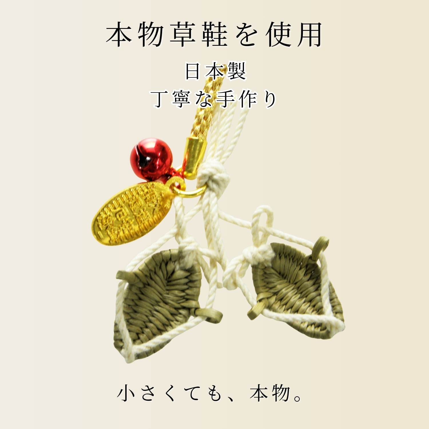 大きさ3〜4cm程の小さな草鞋(わらじ)にストラップ用のひもが付いたお守りです。
