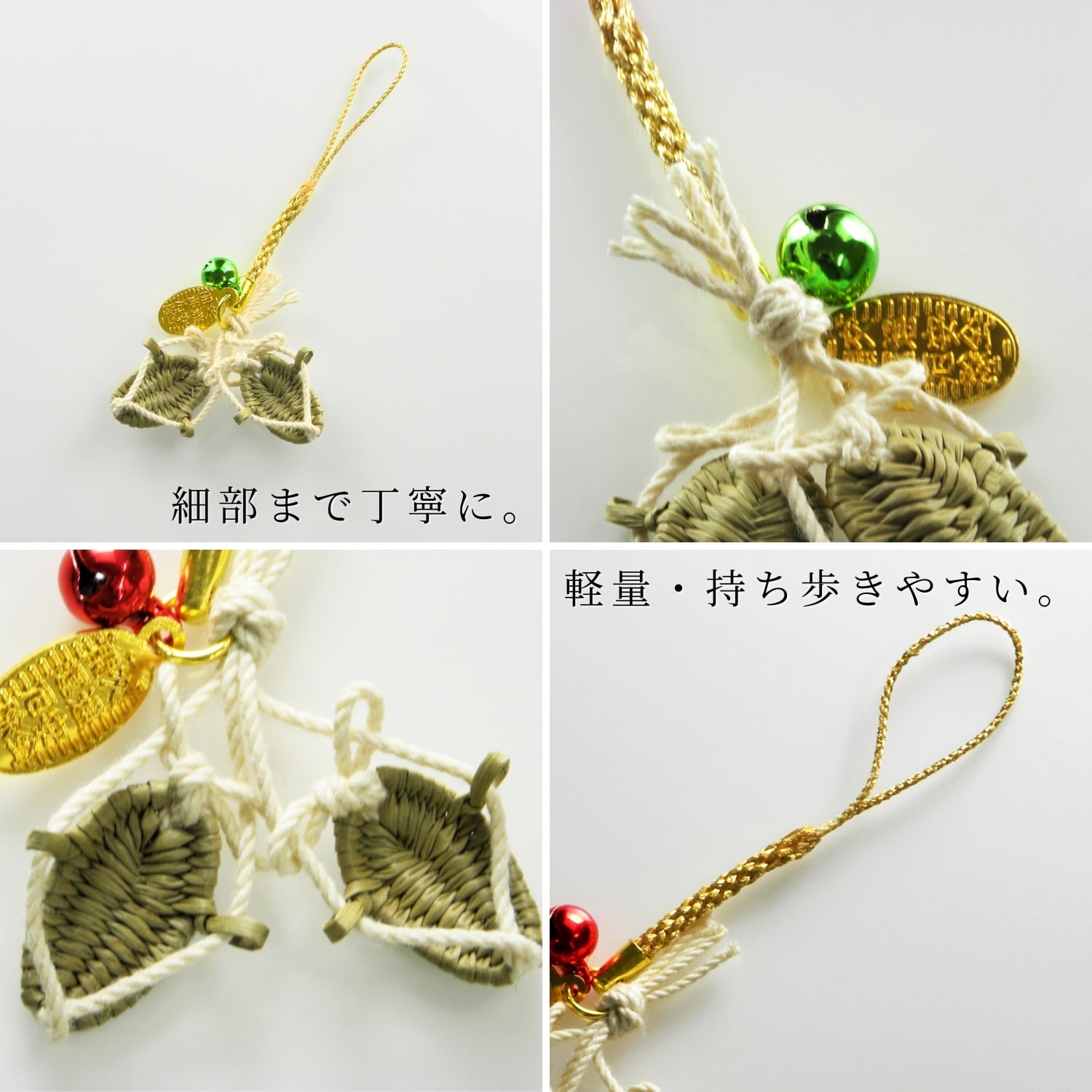 こだわりの金糸で作った根付け紐に縁起の良い宝来鈴、そして、御守小判が付いています。