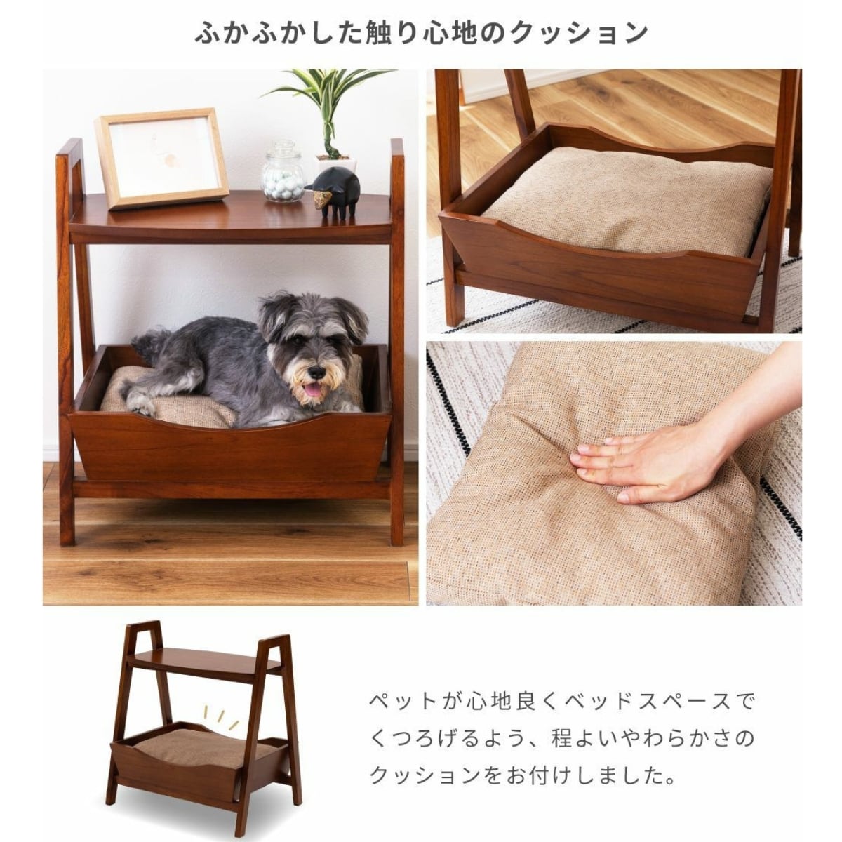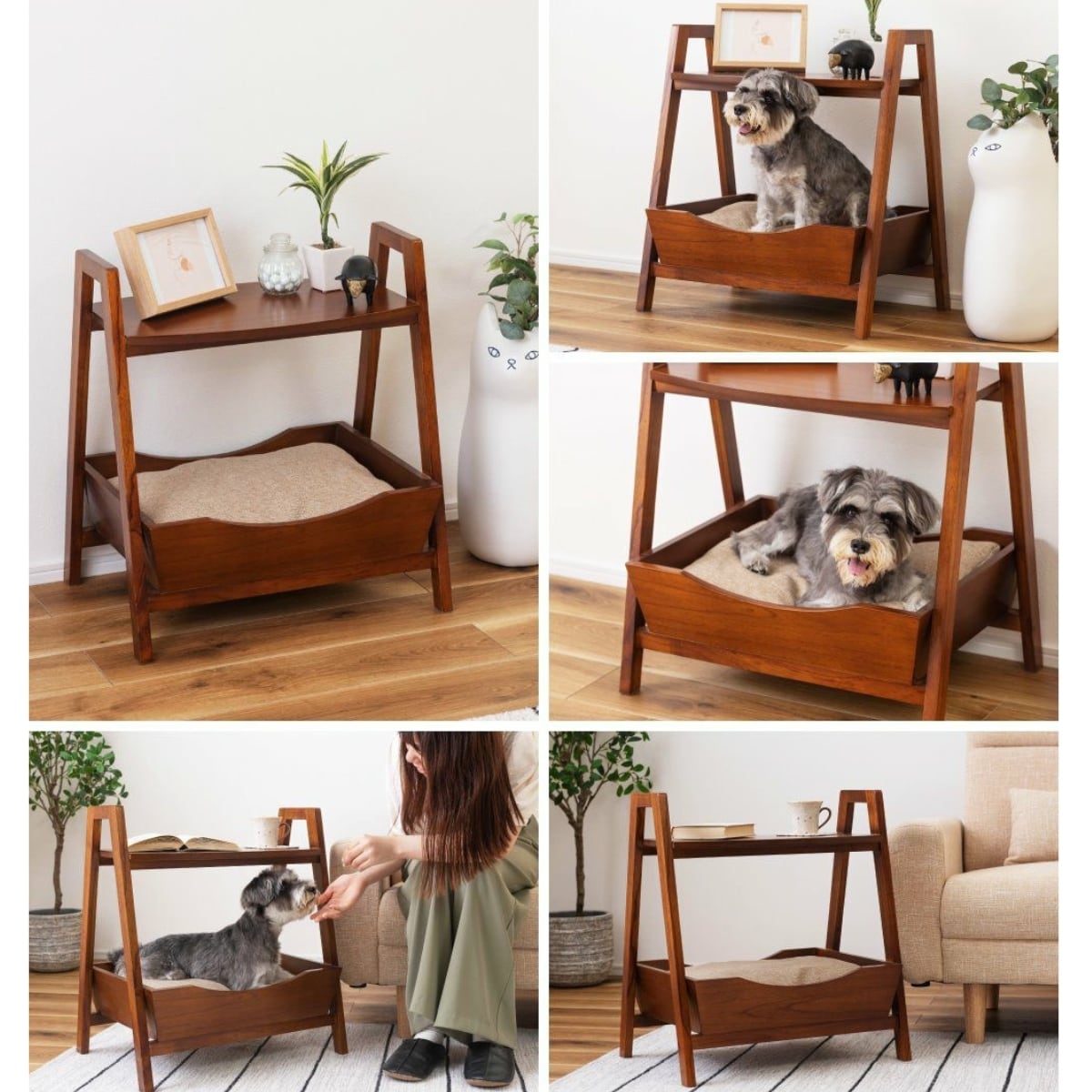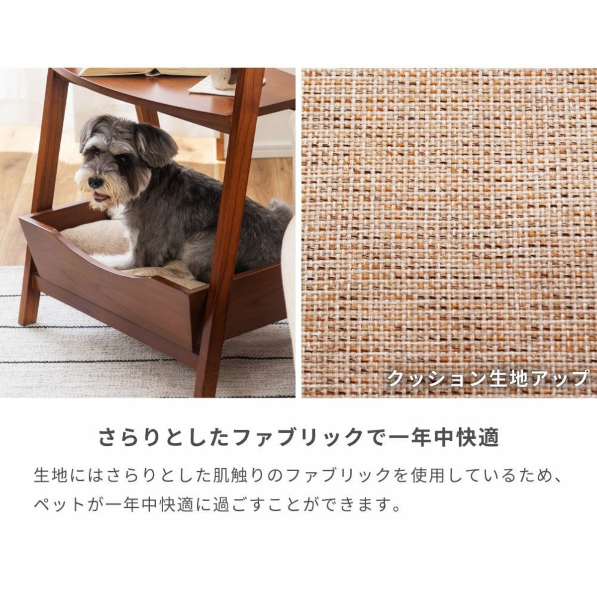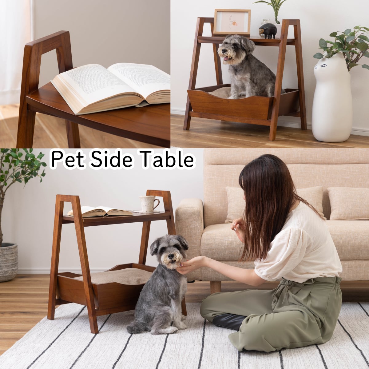 天然木ミンディ材を使用したペット用サイドテーブル。上部は花台や小物置きとして、下部はクッション付きのペットベッドとして使える2WAY仕様。犬・猫・うさぎにも対応し、リビングに自然に溶け込むナチュラルなデザイン。両側に持ち手があり移動も簡単。おしゃれで実用性のあるインテリア家具として、ペットと快適に暮らせる空間を演出します。