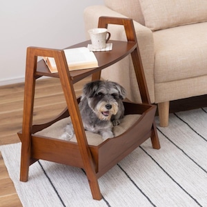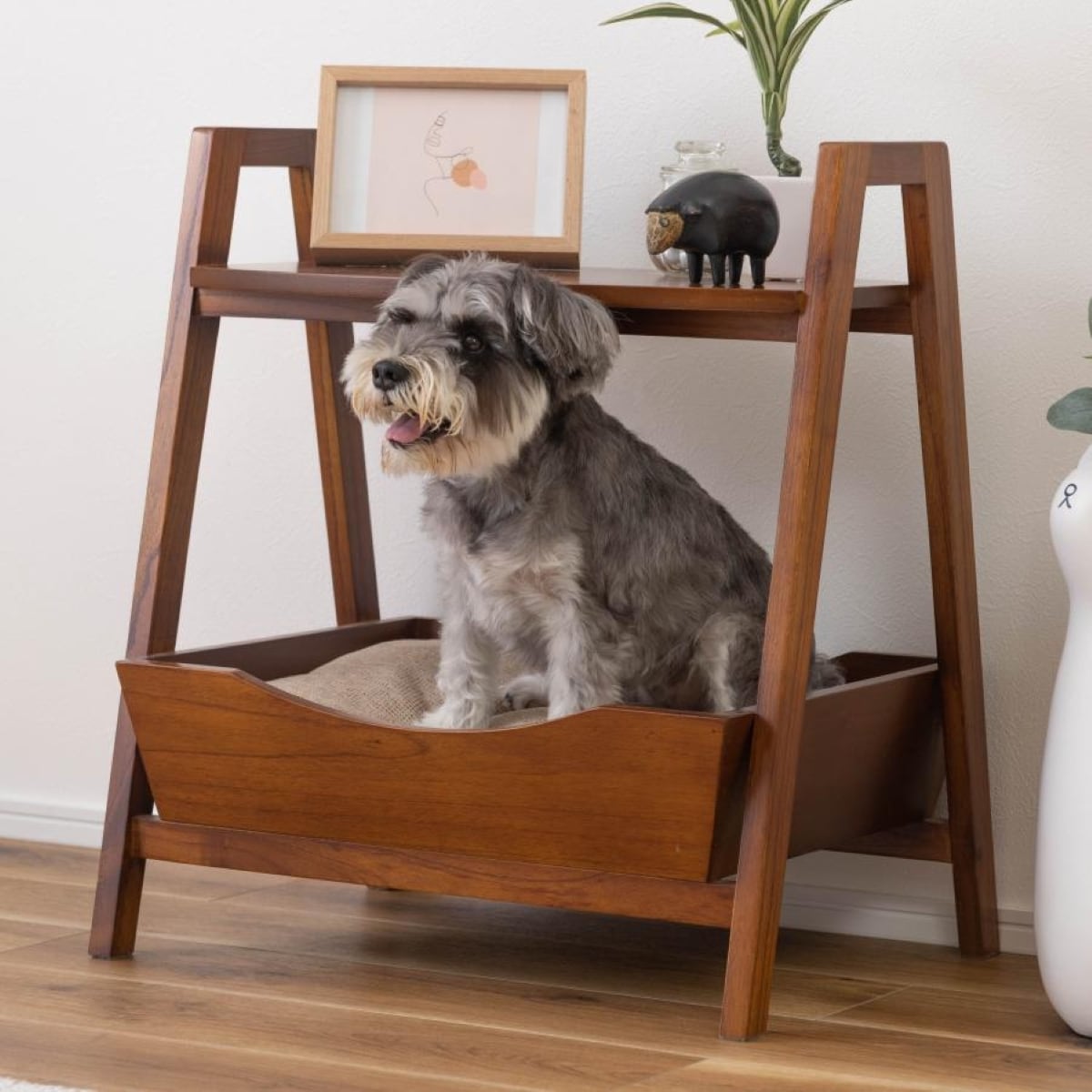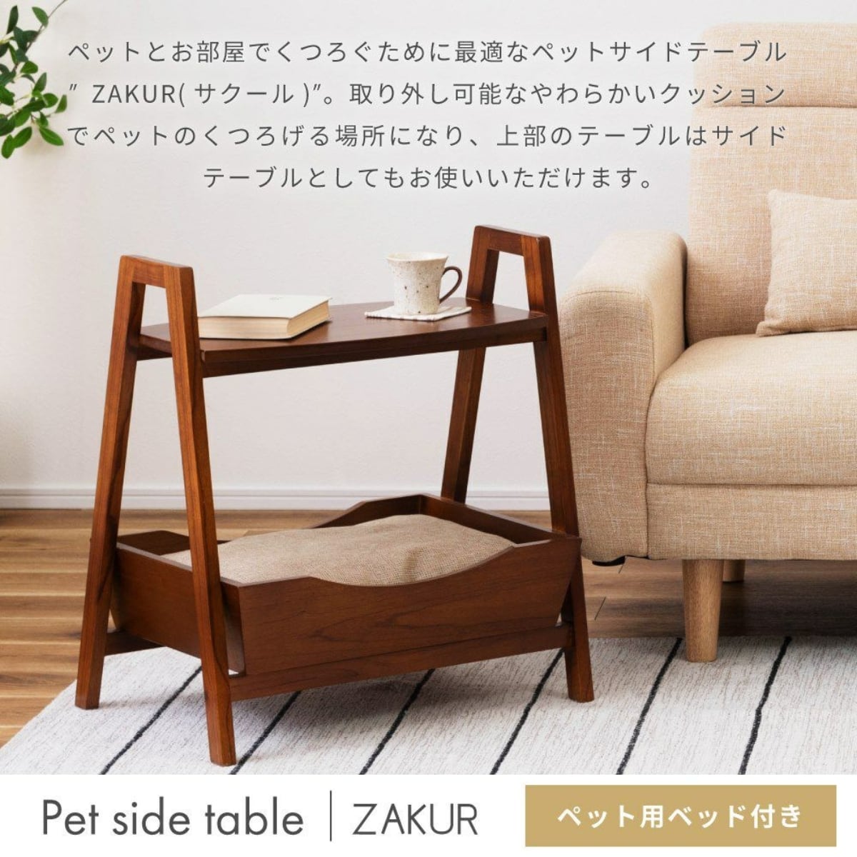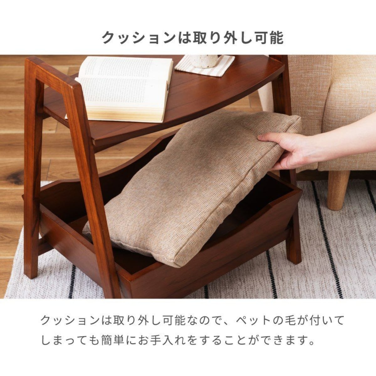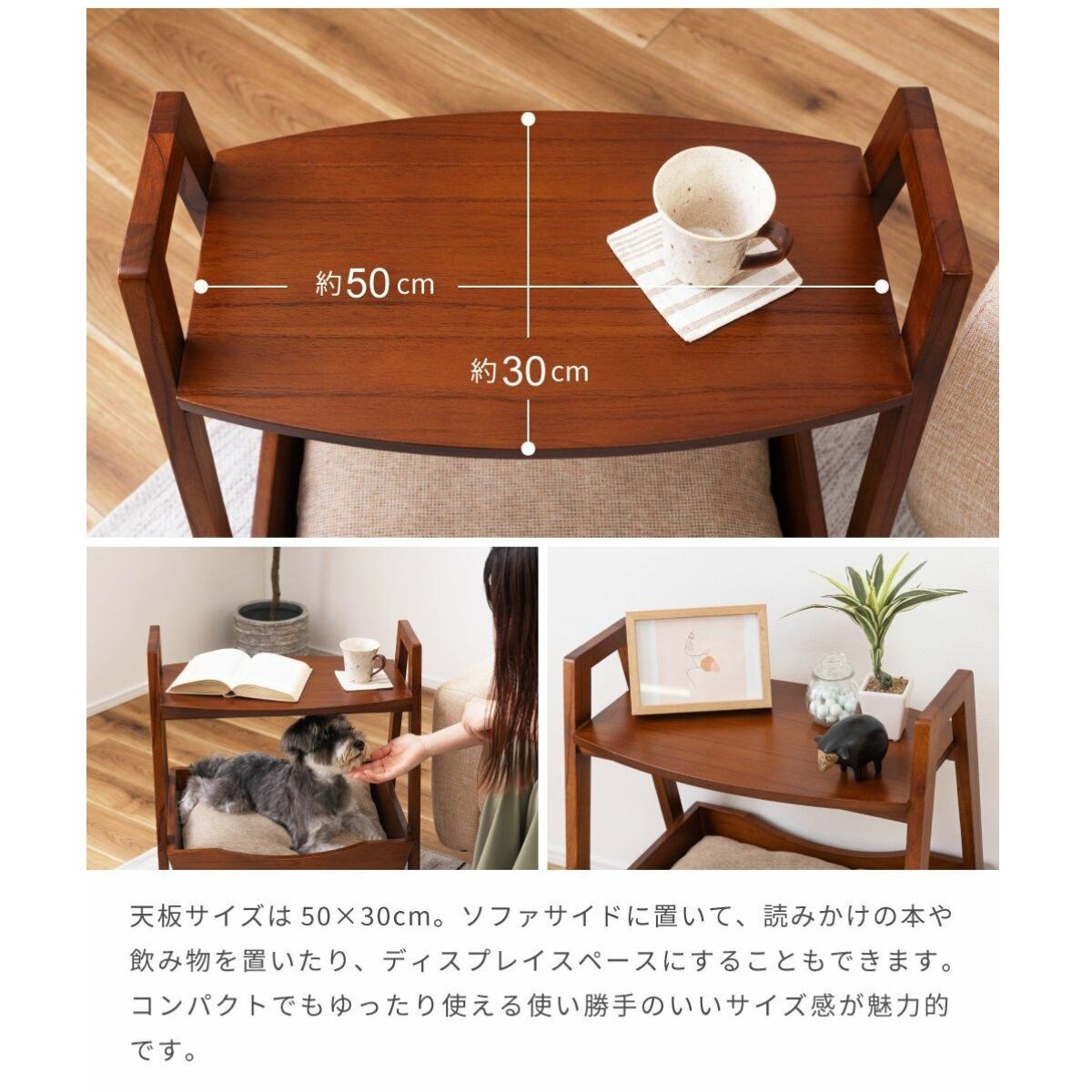 天然木ミンディ材を使用したペット用サイドテーブル。上部は花台や小物置きとして、下部はクッション付きのペットベッドとして使える2WAY仕様。犬・猫・うさぎにも対応し、リビングに自然に溶け込むナチュラルなデザイン。両側に持ち手があり移動も簡単。おしゃれで実用性のあるインテリア家具として、ペットと快適に暮らせる空間を演出します。