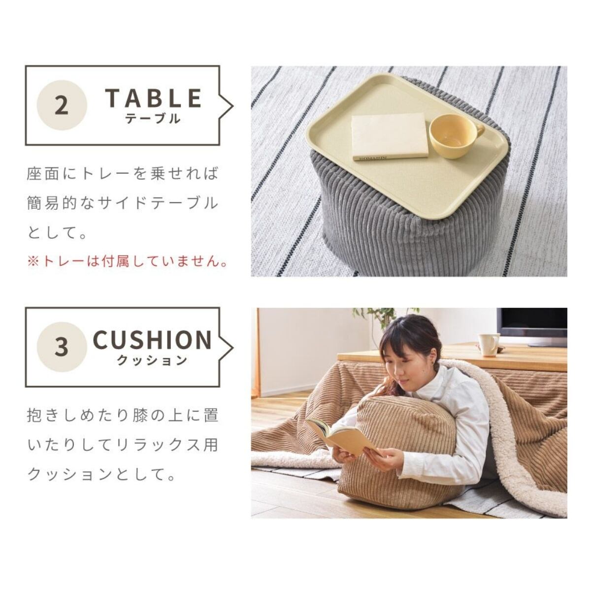 ・クッションとして王道的にお使いいただくこともできますが、沈みこみにくくしっかりとした作りになっているので、スツールとして腰を掛けたり、座面にトレーを載せてサイドテーブルに応用したりと、使い方は様々です。