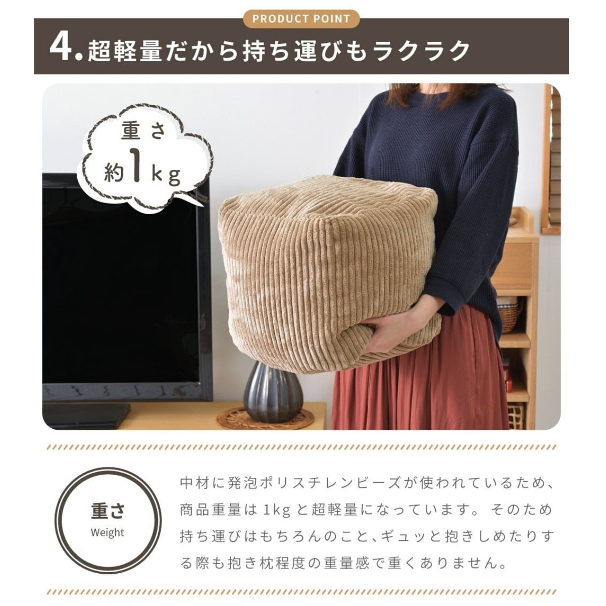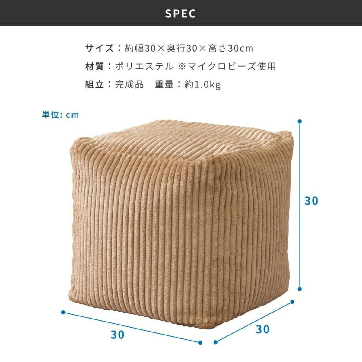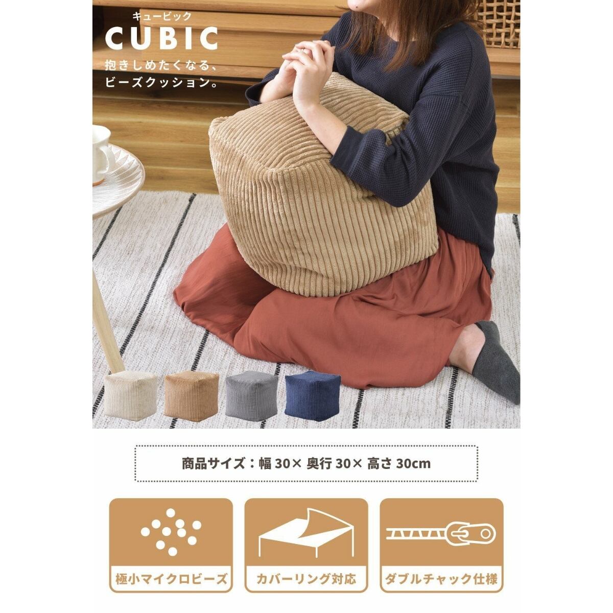 北欧風のかわいいキューブ型ミニビーズクッション。軽量で持ち運びやすく、自立型でサイドテーブルや座椅子にも。コーデュロイ素材がやさしい肌触り。省スペースでも使えるコンパクトサイズ。ナチュラルな3色展開。
